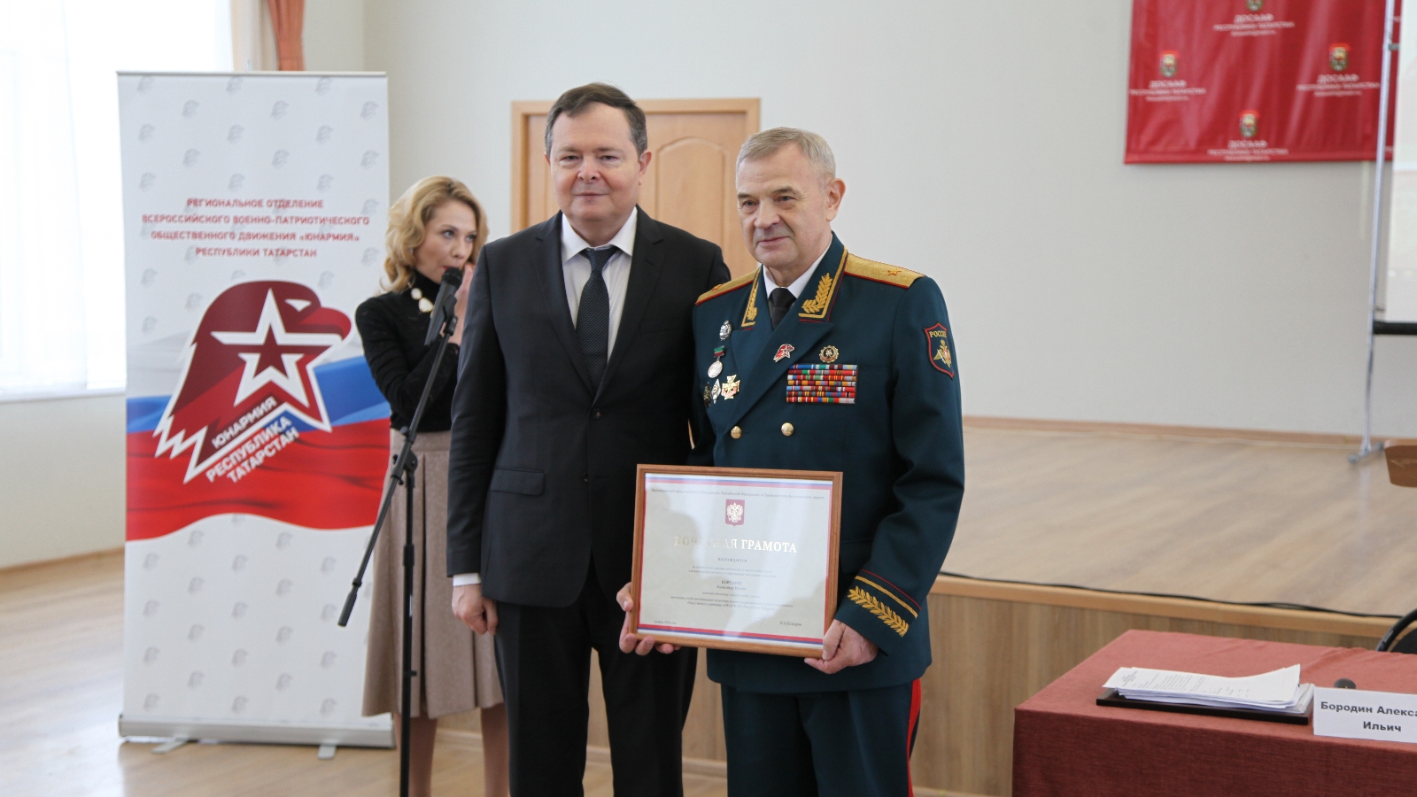 За достигнутые высокие результаты и значительный вклад в военно-патриотическое и нравственное воспитание молодежи начальнику штаба регионального отделения военно-патриотического детско-юношеского общественного движения «ЮНАРМИЯ» в Республике Татарстан Александру Ильичу Бородину Главный федеральный инспектор по РТ вручил Почетную грамоту полномочного представителя Президента Российской Федерации в Приволжском федеральном округе Игоря Анатольевича Комарова.