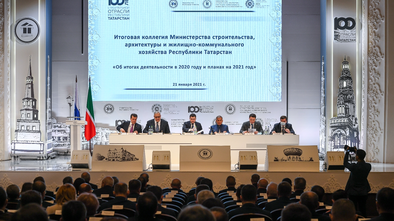 21 января 2021 года в ДК им. Саид-Галиева города Казани состоялась итоговая коллегия Министерства строительства, архитектуры и жилищно-коммунального хозяйства Республики Татарстан, в заседании которой приняли участие Президент Республики Татарстан Рустам Минниханов, Главный федеральный инспектор по РТ Виктор Демидов, заместитель министра строительства и ЖКХ РФ Никита Стасишин, директор ГК – Фонд содействия реформированию ЖКХ Константин Цицин, руководители и представители органов власти.