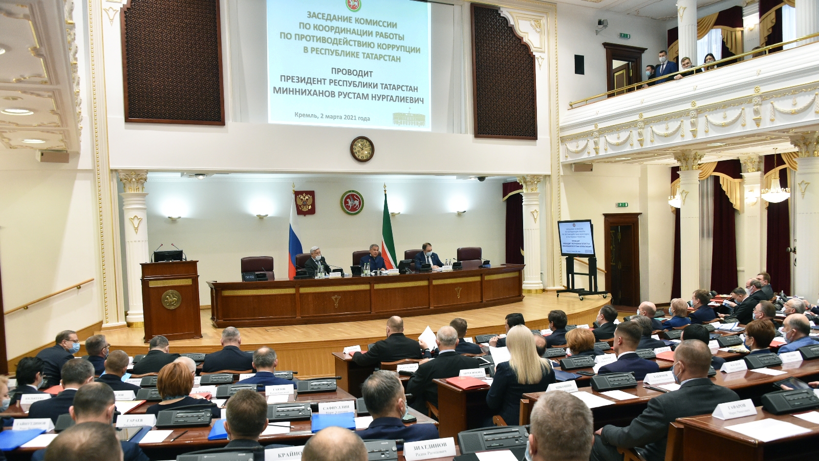 02 марта 2021 года в Казанском Кремле состоялось заседание Комиссии по координации работы по противодействию коррупции в Республике Татарстан. В работе приняли участие Президент РТ Рустам Минниханов, Главный федеральный инспектор по Республике Татарстан Виктор Демидов, Председатель Государственного Совета Татарстана Фарид Мухаметшин, Премьер-министр республики Алексей Песошин, Руководитель Аппарата Президента РТ Асгат Сафаров, руководители различных министерств и ведомств, главы муниципальных образований республики.