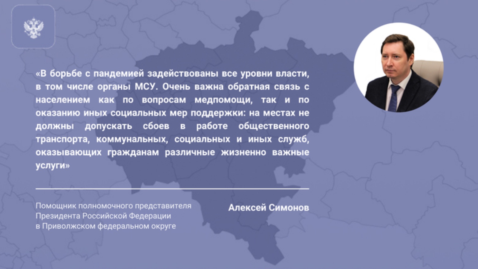 Алексей Симонов обратил внимание участников мероприятия, что на постоянном контроле полномочного представителя находится тема здравоохранения, в том числе борьба с распространением коронавирусной инфекции: на основе данных мониторинга главам регионов даются конкретные рекомендации по принятию различных мер для стабилизации ситуации. «В борьбе с пандемией задействованы все уровни власти, в том числе органы МСУ. Очень важна обратная связь с населением как по вопросам медпомощи, так и по оказанию иных социальных мер поддержки: на местах не должны допускать сбоев в работе общественного транспорта, коммунальных, социальных и иных служб, оказывающих гражданам различные жизненно важные услуги», - подчеркнул помощник полпреда.