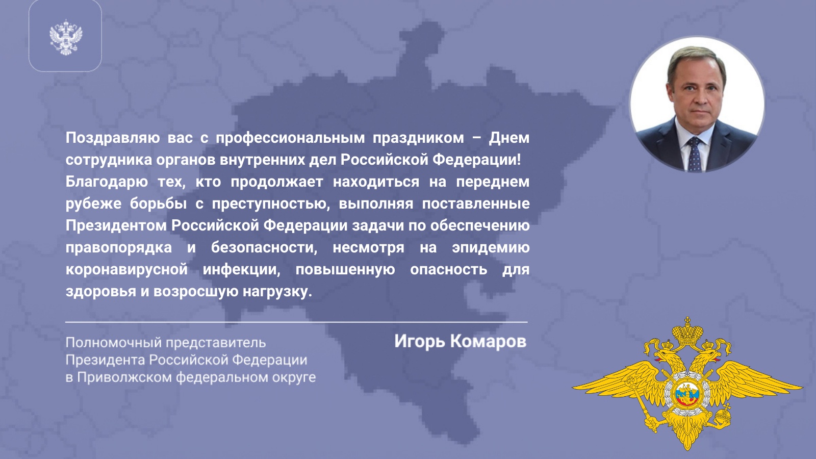 10 ноября отмечается День сотрудника органов внутренних дел Российской Федерации. Полномочный представитель Президента РФ в ПФО Игорь Комаров поздравил личный состав и ветеранов МВД России с профессиональным праздником, поблагодарив их за службу и пожелав успехов в работе.