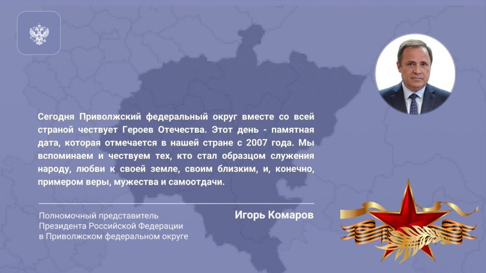 Полномочный представитель Президента Российской Федерации в Приволжском федеральном округе Игорь Комаров поздравил жителей ПФО с Днем Героев Отечества.