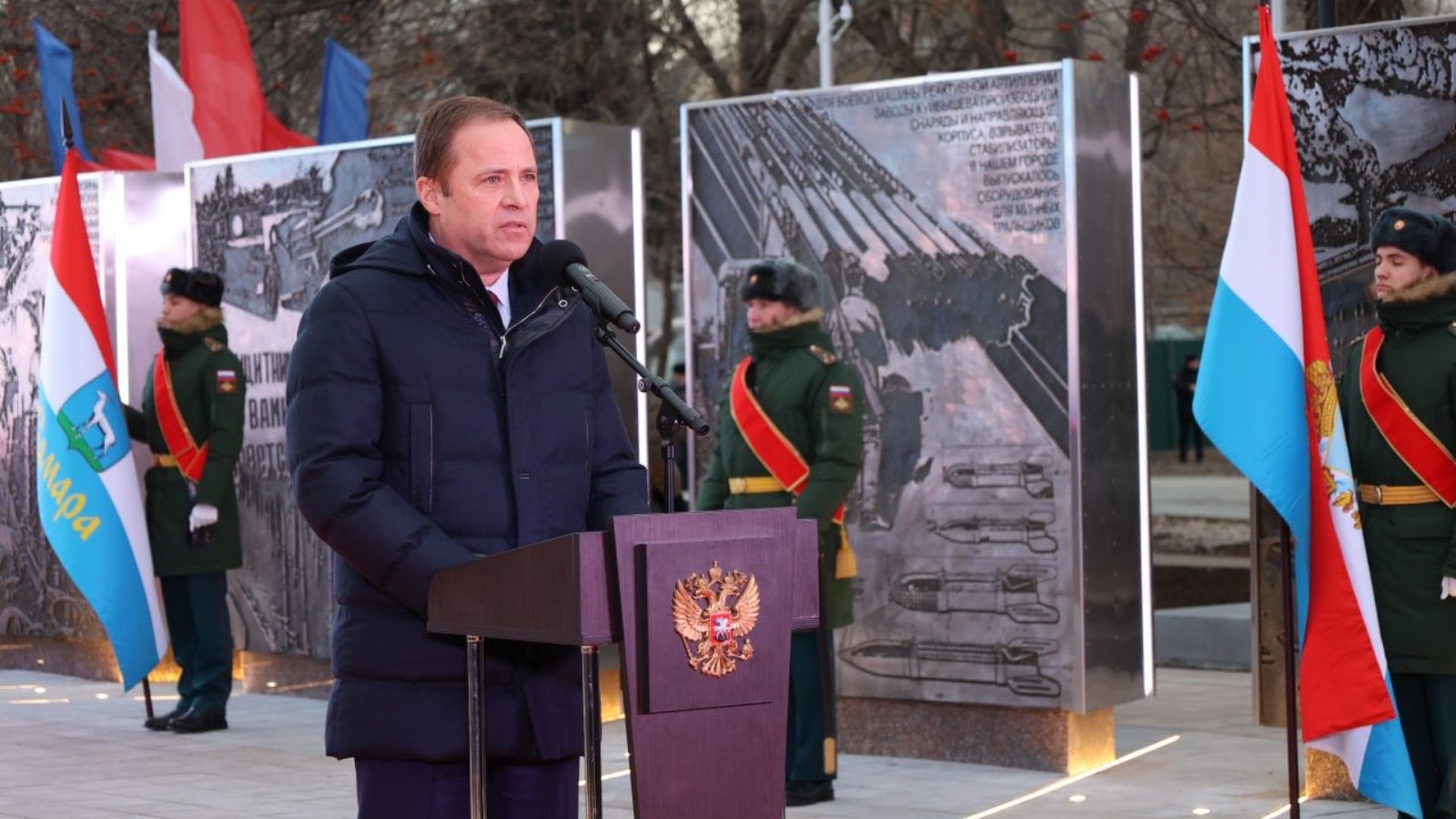 Николай Овсиенко зачитал приветствие от имени Председателя Российского военно-исторического общества, Помощника Президента РФ Владимира Мединского: «Память о беспримерных подвигах тружеников тыла, тех кто создавал надежный несокрушимый фундамент победы - неотъемлемая часть истории Великой Отечественной войны. Особая роль в организации тыловой жизни принадлежит Самаре, носившей в годы великой отечественной войны имя советского государственного партийного деятеля Валериана Куйбышева. В критические дни осени 1941 года, когда враг стоял под стенами Москвы, Куйбышев взял на себя часть столичных функций. В тяжелейших условиях военного времени жители города проявляли подлинный трудовой героизм, отдавали все силы для фронта, для победы над ненавистным врагом. От всей души поздравляю вас с открытием Стелы «Город трудовой доблести»! Память о подвиге жителей города в годы Великой Отечественной Войны всегда будет жить в сердцах благодарных потомков и всех россиян».