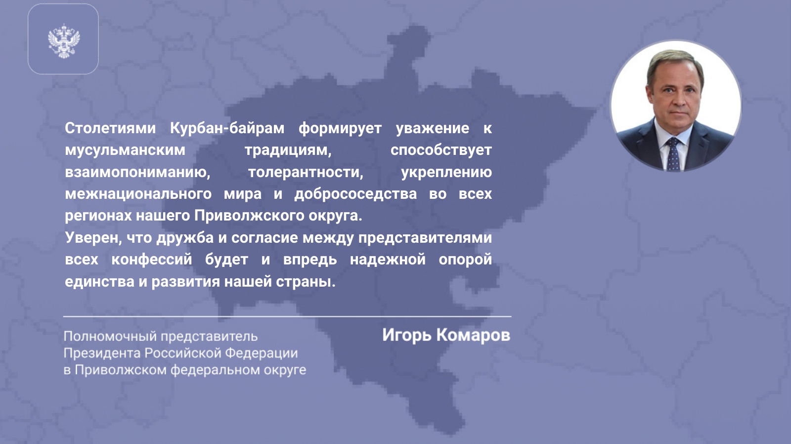 Столетиями Курбан-байрам формирует уважение к мусульманским традициям, способствует взаимопониманию, толерантности, укреплению межнационального мира и добрососедства во всех регионах нашего Приволжского округа.