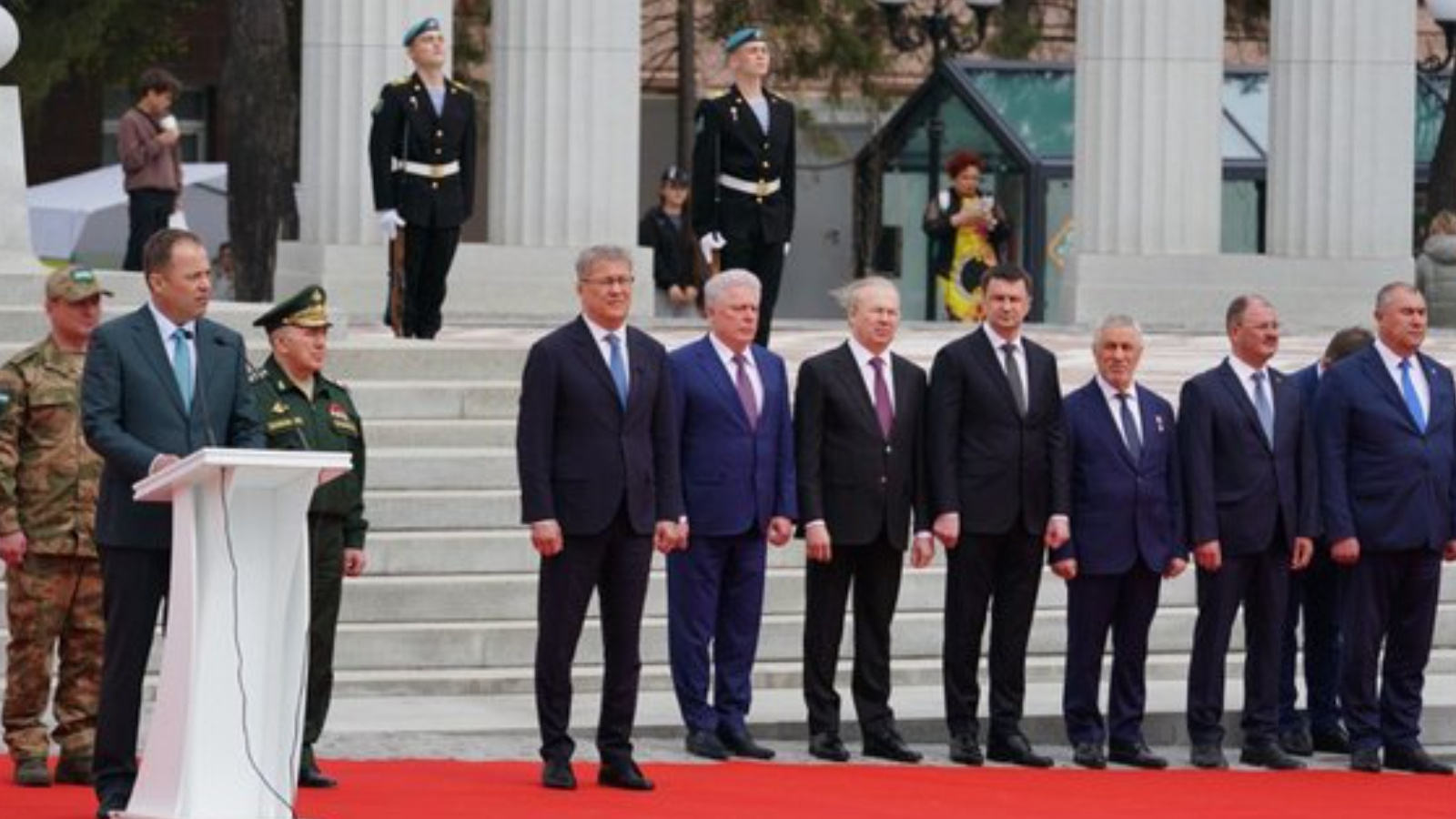 Перед началом церемонии Игорь Комаров, Руслан Цаликов, Радий Хабиров и командир батальона имени Даяна Мурзина возложили цветы к памятнику Герою России, генерал-майору Минигали Шаймуратову.