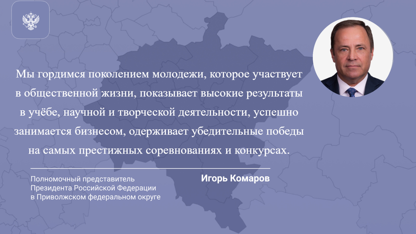 Сегодня мы отмечаем замечательный, веселый, яркий праздник – День молодежи. У нас в ПФО живут и работают активные, целеустремленные, успешные молодые люди. Одно из подтверждений этому – наши общественные проекты. Мы гордимся поколением молодежи, которое участвует в общественной жизни, показывает высокие результаты в учёбе, научной и творческой деятельности, успешно занимается бизнесом, одерживает убедительные победы на самых престижных соревнованиях и конкурсах.