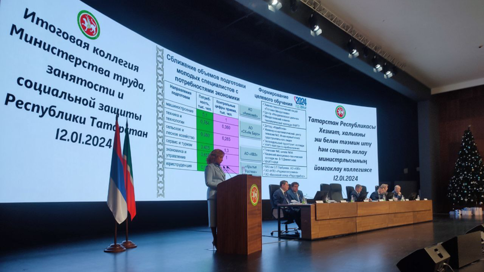 12 января 2024 года в IT-парке им. Б. Рамеева состоялось заседание итоговой коллегии Министерства труда, занятости и социальной защиты РТ на тему: «Труд, занятость и социальная защита: итоги 2023 года и задачи на 2024 год». В мероприятии приняли участие Главный федеральный инспектор по РТ Виктор Демидов, заместитель Председателя Государственного Совета РТ Юрий Камалтынов, первый заместитель Премьер-министра РТ Рустам Нигматуллин, председатель Ассоциации «Совет муниципальных образований Республики Татарстан» Экзам Губайдуллин и другие.