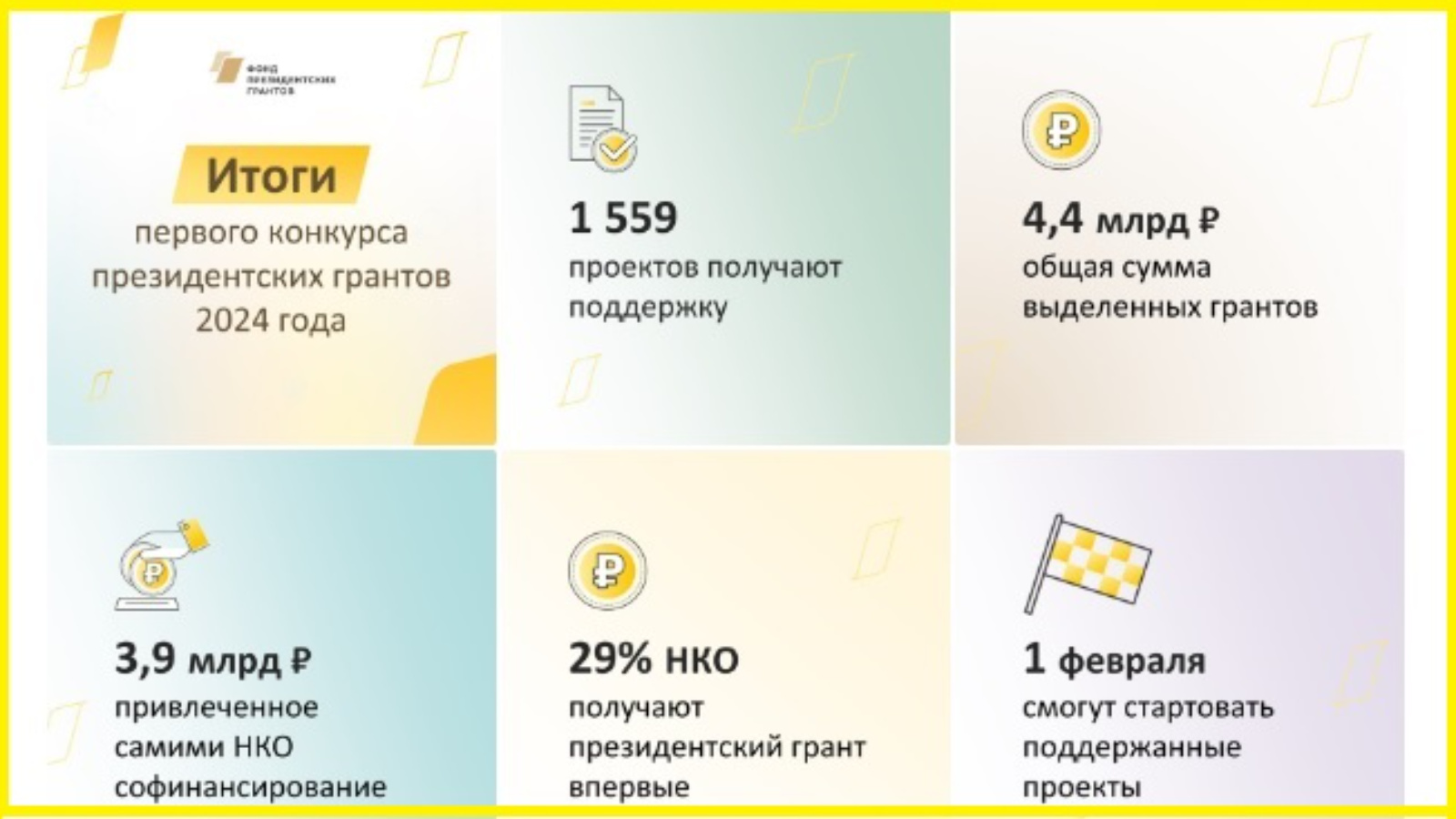 12 января 2024 года на заседании Координационного комитета под председательством Первого заместителя Руководителя Администрации Президента Российской Федерации Сергея Кириенко подведены итоги первого в этом году конкурса по распределению грантов Главы государства. Всего в Фонд поступило 10,8 тыс. проектов, победителями признаны 1 559 заявок, получивших финансирование на сумму 4,4 млрд рублей.