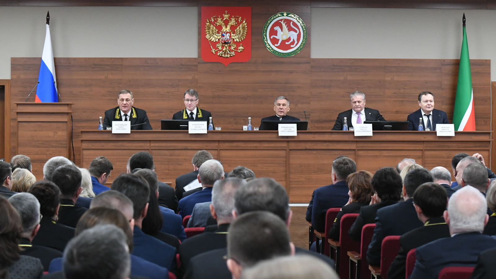 27 февраля 2024 года в Советском районном суде г. Казани состоялось итоговое совещание судей Республики Татарстан по итогам деятельности за 2023-ий год. В работе приняли участие Глава (Раис) РТ Рустам Минниханов, Главный федеральный инспектор по РТ Виктор Демидов, Председатель Арбитражного суда Поволжского округа Денис Плотников, и.о. Председателя Верховного Суда РТ Эдуард Каминский, Начальник Управления Судебного департамента в РТ Зявдат Салихов и другие.