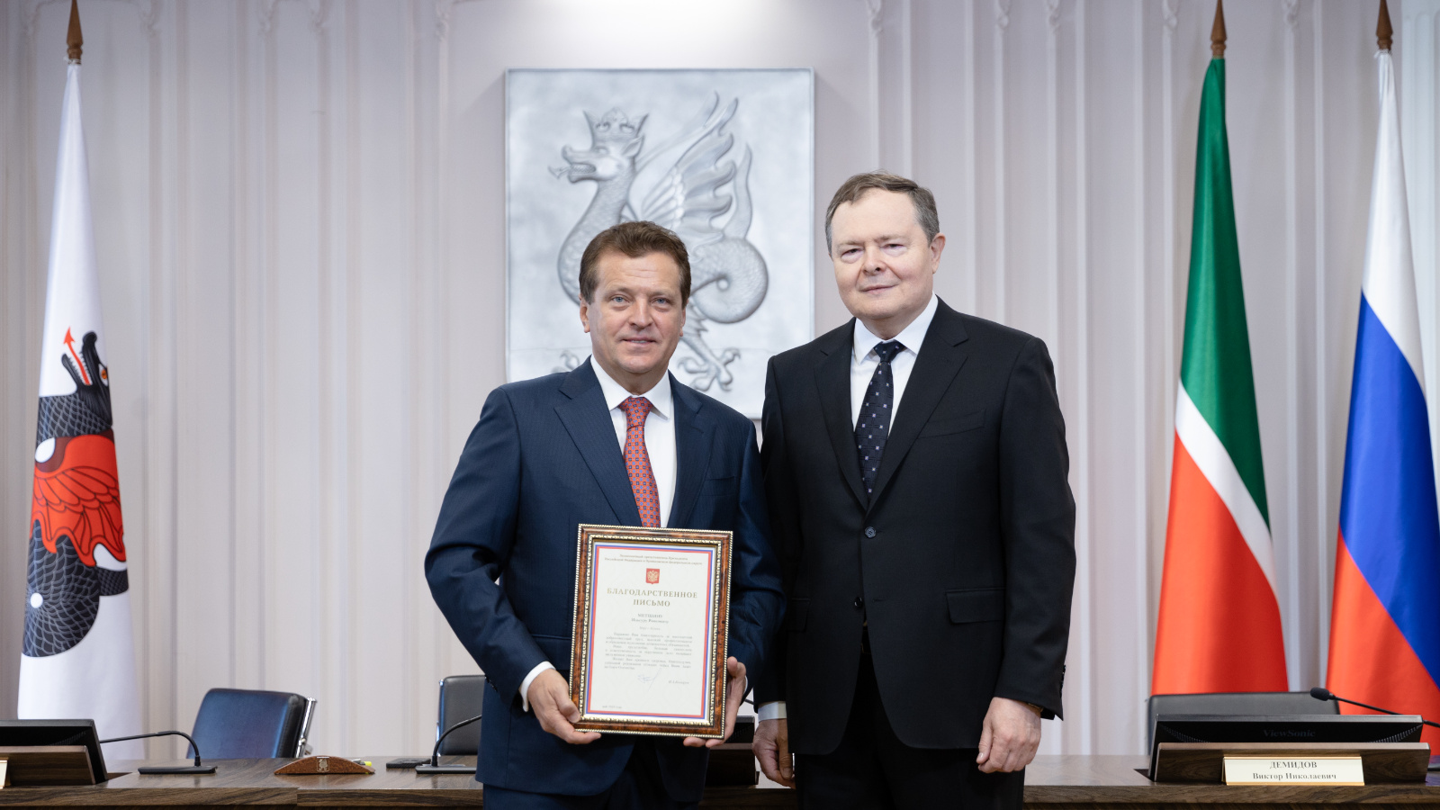 27 мая 2024 года по поручению полномочного представителя Президента Российской Федерации в Приволжском федеральном округе Игоря Комарова Главный федеральный инспектор по Республике Татарстан Виктор Демидов в торжественной обстановке вручил Мэру города Казани Ильсуру Метшину Благодарственное письмо полномочного представителя Президента Российской Федерации в Приволжском федеральном округе за многолетний добросовестный труд, высокий профессионализм и образцовое исполнение должностных обязанностей.