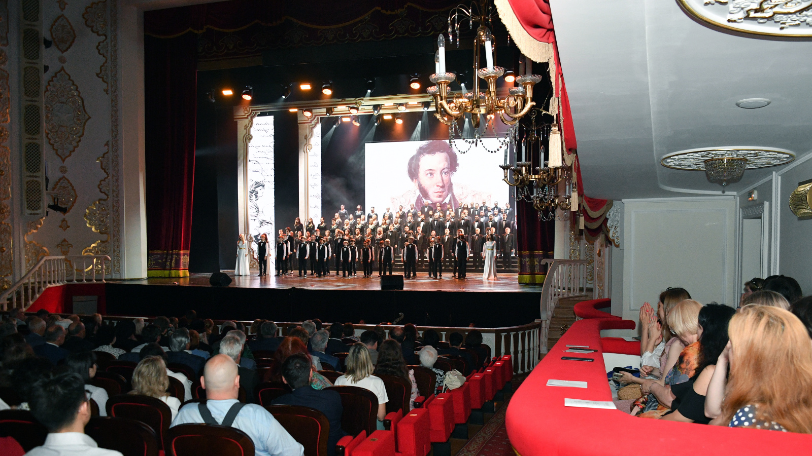 Сегодня в Татарском государственном академическом театре оперы и балета им. Мусы Джалиля прошло торжественное мероприятие, посвящённое Дню русского языка и 225-й годовщине со дня рождения А.С. Пушкина. В церемонии приняли участие Глава (Раис) Татарстана Рустам Минниханов, Государственный советник Республики Татарстан Минтимер Шаймиев, Главный федеральный инспектор по Республике Татарстан Виктор Демидов, Председатель Государственного Совета Республики Татарстан Фарид Мухаметшин и другие почетные гости.