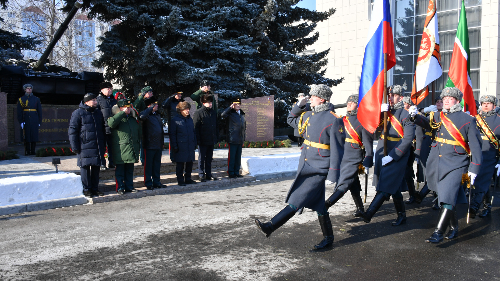 22 февраля 2025 года на территории Казанского высшего танкового командного ордена Жукова Краснознаменного училища состоялась церемония возложения венка к стеле «Героям - выпускникам КВТКУ».