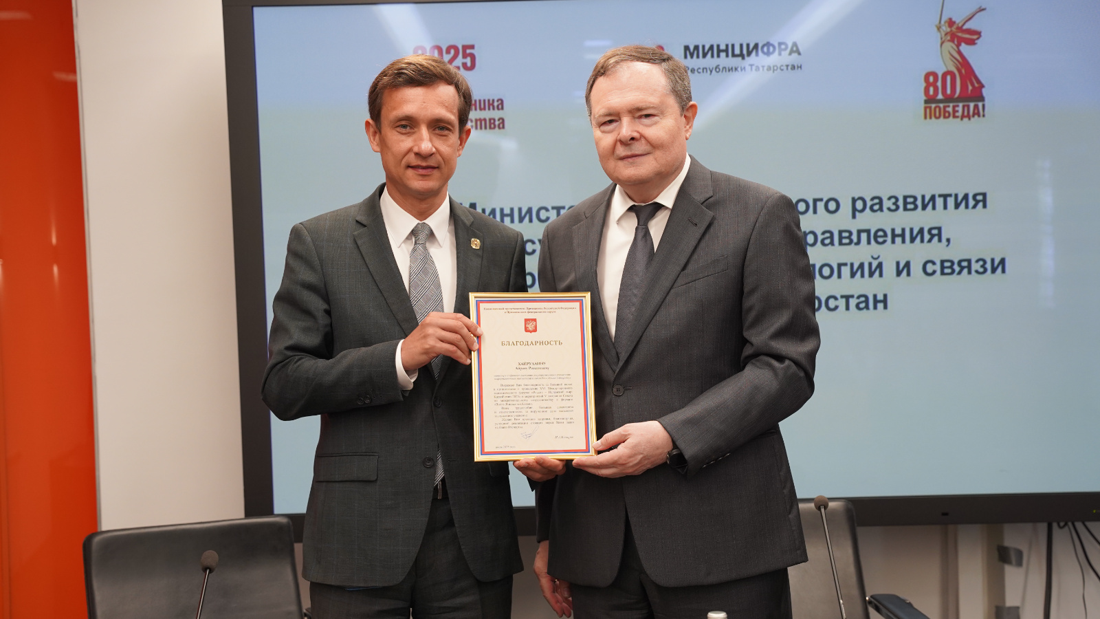 17 июля 2025 года в Министерстве цифрового развития государственного управления, информационных технологий и связи РТ, в торжественной обстановке Главный федеральный инспектор по Республике Татарстан Виктор Демидов вручил Благодарность полномочного представителя Президента Российской Федерации в Приволжском федеральном округе Игоря Комарова министру цифрового развития государственного управления, информационных технологий и связи РТ Айрату Хайруллину, за большой вклад в организацию и проведение XVI Международного экономического форума «Россия – Исламский мир: KazanForum 2025» и мероприятий V заседания Совета по межрегиональному сотрудничеству в формате «Волга-Янцзы» в г. Казани.