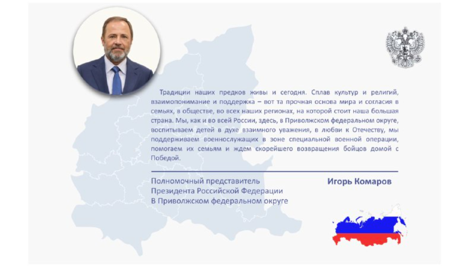 Традиции наших предков живы и сегодня. Сплав культур и религий, взаимопонимание и поддержка – вот та прочная основа мира и согласия в семьях, в обществе, во всех наших регионах, на которой стоит наша большая страна. Мы, как и во всей России, здесь, в Приволжском федеральном округе, воспитываем детей в духе взаимного уважения, в любви к Отечеству, мы поддерживаем военнослужащих в зоне специальной военной операции, помогаем их семьям и ждем скорейшего возвращения бойцов домой с Победой.