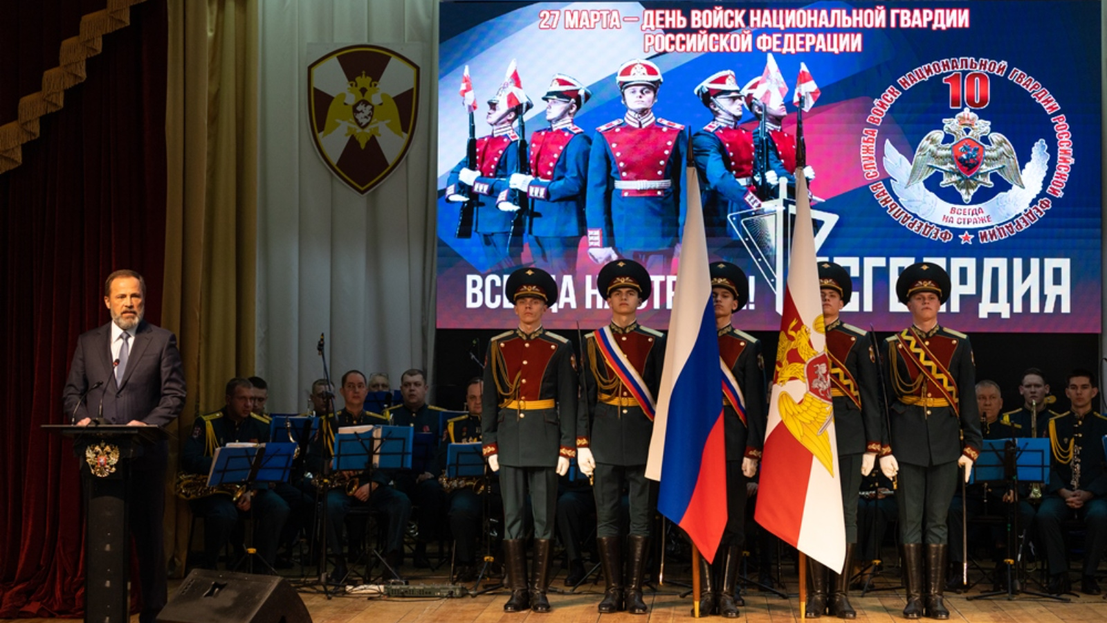 «Сейчас каждый из вас на своём месте пишет современную историю службы, демонстрирует высокий уровень профессионализма, беззаветную преданность присяге и избранному делу. «Всегда на страже!» – девиз всех росгвардейцев. Бойцы на переднем крае защищают закон и порядок, участвуют в ликвидации последствий стихийных бедствий, аварий и катастроф, спасают людей, стоят на защите национальных интересов Отчизны. Ваш вклад в поддержание конституционного и общественного порядка, обеспечение безопасности граждан неоценим. Выражаю слова глубокой благодарности и ветеранам, бесценный опыт которых во многом способствует укреплению связи поколений, военно-патриотическому воспитанию молодёжи, настоящих и будущих защитников», – обратился к военнослужащим губернатор Нижегородской области, секретарь нижегородского регионального отделения партии «Единая Россия» Глеб Никитин.